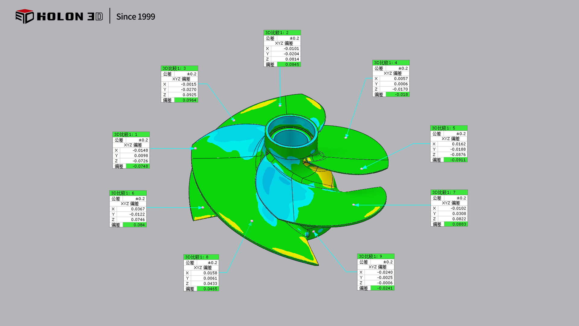 采用 HOLON 3D Smart 49 手持式全藍(lán)激光工業(yè)級三維掃描儀,針對性破解葉輪螺旋槳掃描的核心難題。該掃描儀搭載全藍(lán)激光技術(shù),抗反光能力優(yōu)異,可有效抑制螺旋槳表面的反光干擾,清晰捕捉葉片的曲面弧度、邊緣輪廓及細(xì)微結(jié)構(gòu),確保掃描精度完全匹配逆向建模的嚴(yán)苛要求;非接觸式掃描方式避免與薄葉片直接接觸,從根本上杜絕葉片變形,保障數(shù)據(jù)真實(shí)反映工件原始狀態(tài);手持設(shè)計(jì)靈活便捷,可自由調(diào)整掃描角度,輕松覆蓋葉片根部、背面等隱蔽部位,無測量盲區(qū),全面保障數(shù)據(jù)完整性;高速掃描能力大幅縮短數(shù)據(jù)采集時(shí)間,快速還原螺旋槳整體結(jié)構(gòu),無需分段拼接即可獲取完整三維數(shù)據(jù),有效規(guī)避拼接誤差;掃描儀適應(yīng)性強(qiáng),無需復(fù)雜的表面預(yù)處理,即可在現(xiàn)場快速開展掃描作業(yè)。掃描后生成的三維數(shù)據(jù)完整、精準(zhǔn),可直接用于逆向建模,完全符合客戶需求,為摩托艇葉輪螺旋槳的產(chǎn)品復(fù)刻、性能優(yōu)化及備件生產(chǎn)提供了高效且可靠的數(shù)字化保障。