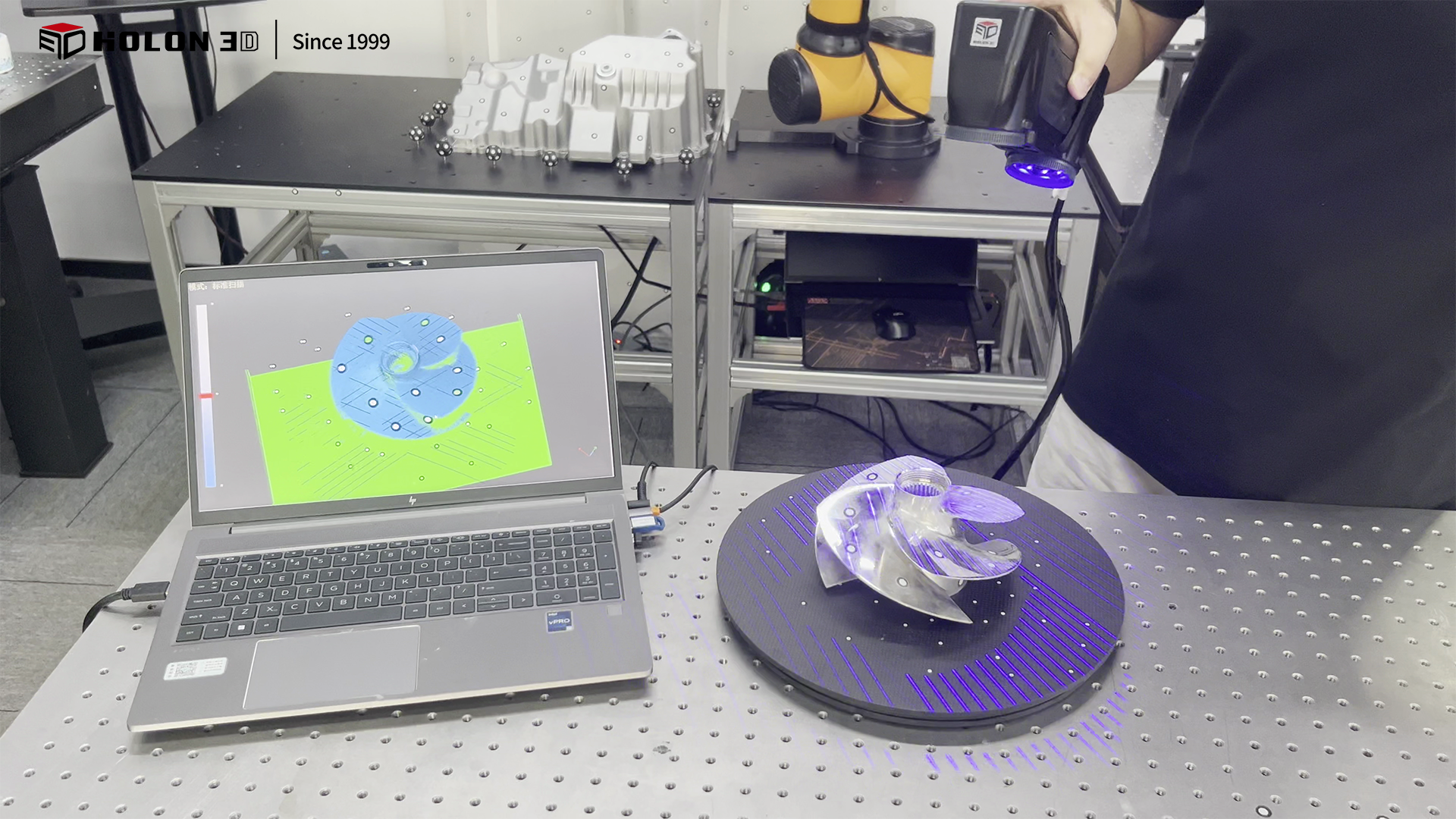 葉輪螺旋槳是摩托艇的核心動力部件,其葉片弧度、尺寸精度與整體結(jié)構(gòu)完整性直接決定航行速度與動力效率??蛻粜鑼υ撃ν型~輪螺旋槳進(jìn)行三維掃描,獲取精準(zhǔn)完整的三維數(shù)據(jù)以開展逆向建模,為產(chǎn)品復(fù)刻、性能優(yōu)化或備件生產(chǎn)提供可靠依據(jù)。由于螺旋槳表面存在反光特性,且葉片部位較薄,客戶對掃描精度與工件數(shù)據(jù)完整性要求極高,傳統(tǒng)測量方式難以滿足需求,因此選擇 HOLON 3D Smart 49 手持式全藍(lán)激光工業(yè)級三維掃描儀,為螺旋槳的數(shù)字化逆向建模提供高效精準(zhǔn)的技術(shù)支撐。