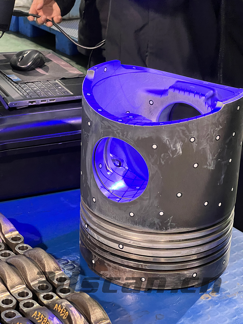 1.活塞形狀成不規(guī)則圓柱形,而且表面帶有環(huán)槽,突顯得凹凸不平,三面都有孔位,側(cè)邊的孔位相通,很容易導(dǎo)致掃描會不齊全;底部是鏤空的,里面的結(jié)構(gòu)復(fù)雜凹凸不平,周邊也是會有不平整
