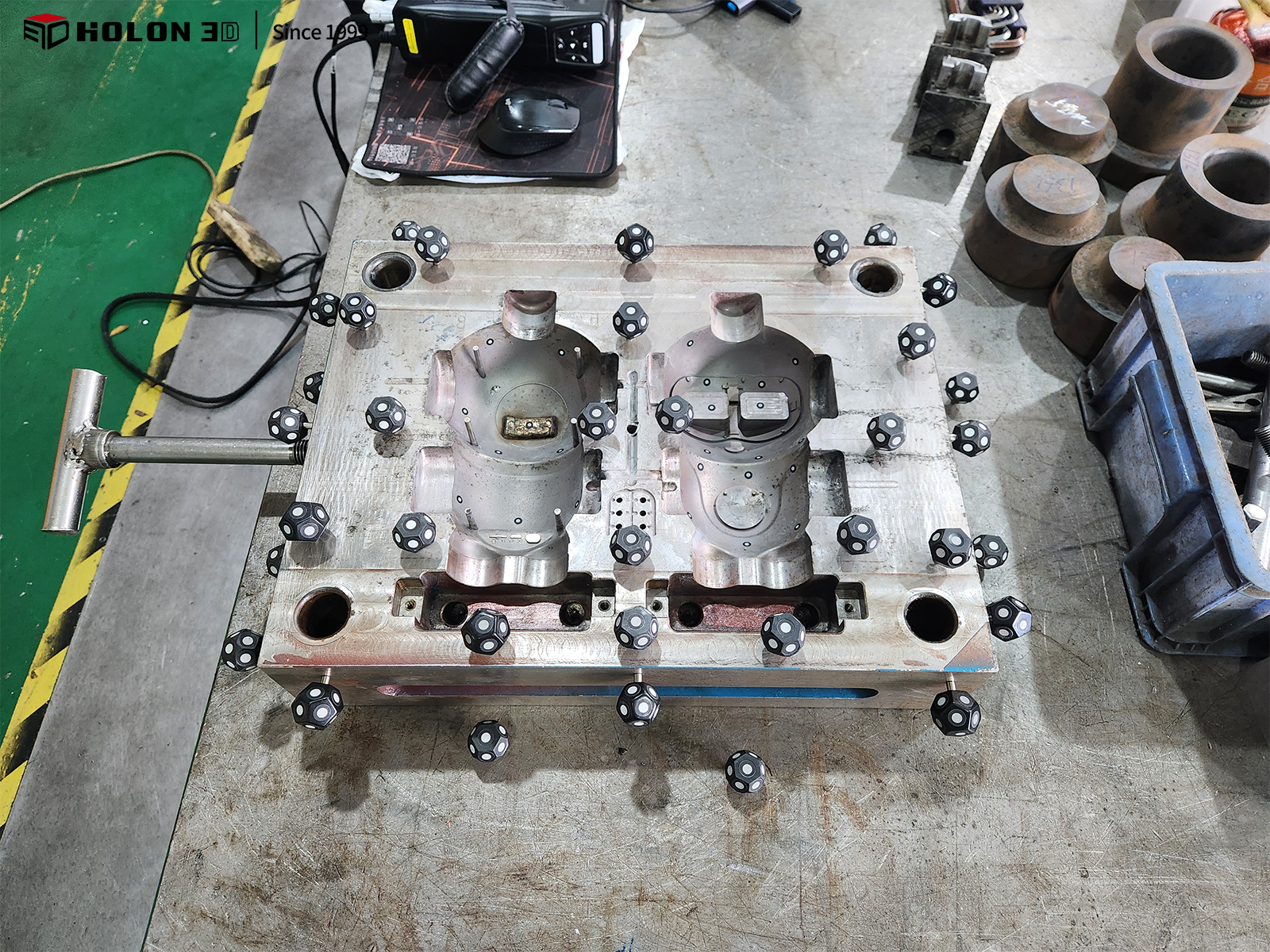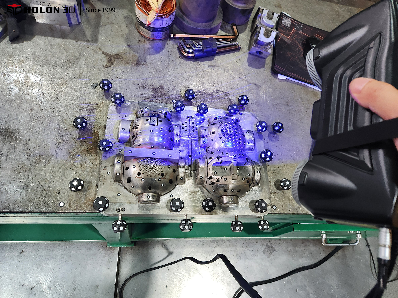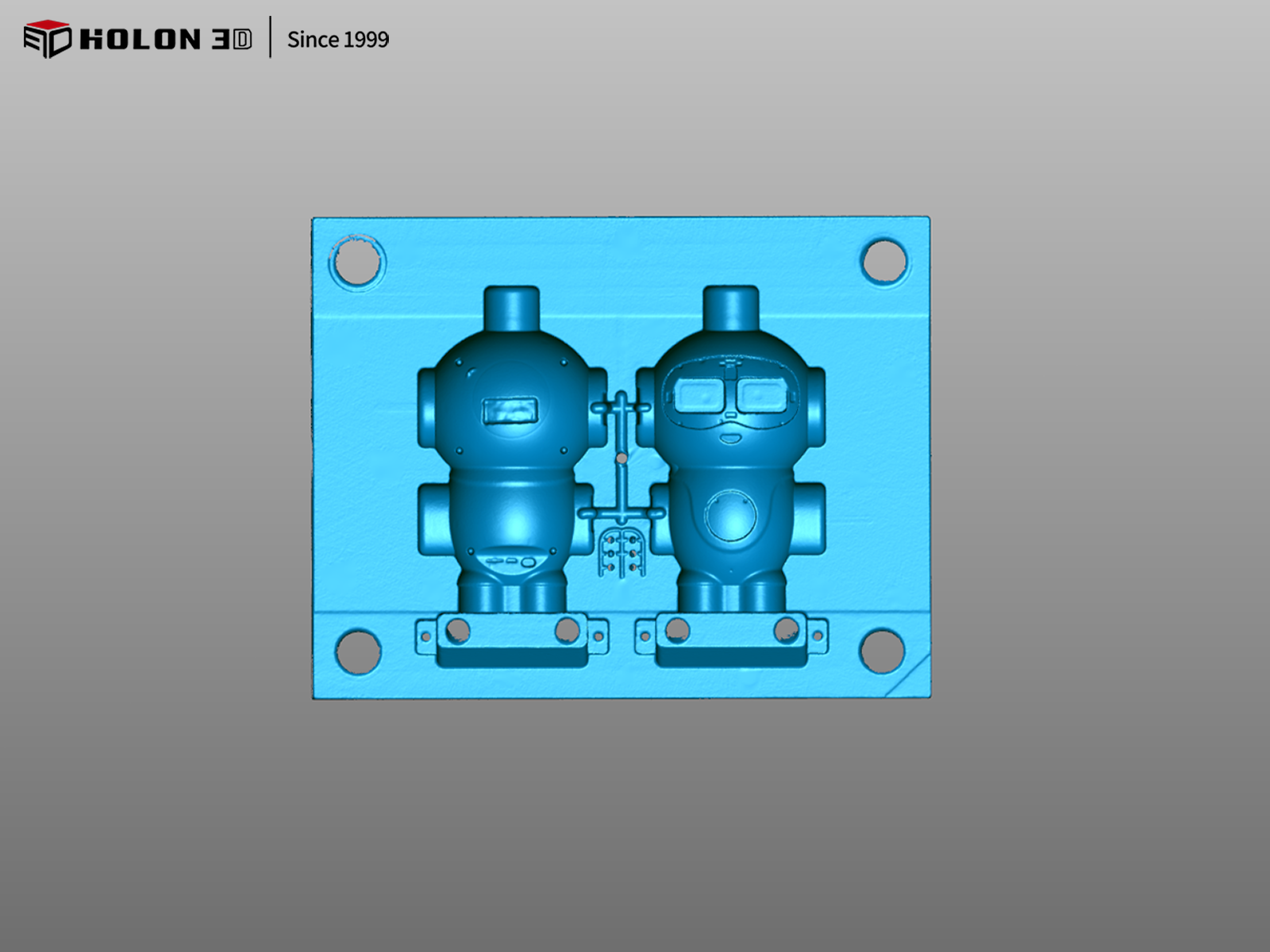 公仔模具是塑造公仔外形的核心工具,其表面的細節(jié)特征直接決定公仔產品的外觀精致度??蛻粜鑼υ撃>哌M行三維數(shù)據(jù)采集,通過逆向建模還原模具結構,為模具的修復、復刻或設計優(yōu)化提供依據(jù)。由于模具表面特征豐富且存在反光問題,同時客戶對掃描速度與精度有較高要求,傳統(tǒng)測量方式難以滿足需求,因此選擇 HOLON 3D smart 49 手持式全藍激光三維掃描儀,為模具的數(shù)字化逆向建模提供精準數(shù)據(jù)支撐。