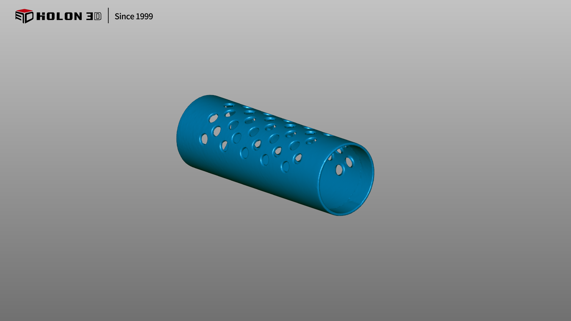 激光切割不銹鋼空心管作為工業(yè)裝配中的關(guān)鍵結(jié)構(gòu)件,其整體質(zhì)量與孔位精度直接影響后續(xù)裝配的適配性??蛻粜鑼υ摷す馇懈罟苓M(jìn)行三維掃描,獲取精準(zhǔn)三維數(shù)據(jù)以開展質(zhì)量檢測,核心驗(yàn)證管體整體形態(tài)是否合格、激光切割孔位的位置偏差是否在公差范圍內(nèi)。由于工件為不銹鋼材質(zhì)且表面反光強(qiáng)烈,同時(shí)分布著大量激光切割孔,客戶對掃描精度與工件數(shù)據(jù)完整性要求極高,傳統(tǒng)測量方式難以滿足需求,因此選擇 HOLON 3D Smart 49 手持式全藍(lán)激光工業(yè)級(jí)三維掃描儀,為激光切割管的質(zhì)量檢測提供可靠數(shù)字化支撐。