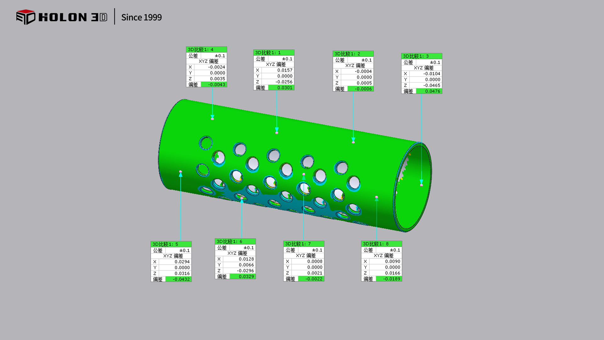 不銹鋼空心管表面反光強(qiáng)烈,傳統(tǒng)光學(xué)測量易受反光干擾,導(dǎo)致管體表面數(shù)據(jù)畸變、孔位邊緣模糊,無法精準(zhǔn)捕捉孔位尺寸與位置信息;管體上的激光切割孔數(shù)量多且分布密集,傳統(tǒng)測量工具需逐孔手動(dòng)定位測量,不僅效率極低,還易因人工操作誤差導(dǎo)致孔位偏差數(shù)據(jù)失真,難以全面驗(yàn)證所有孔位的合格性;同時(shí),客戶需獲取管體整體完整數(shù)據(jù)以檢測形態(tài)精度,傳統(tǒng)分段測量易產(chǎn)生拼接誤差,破壞管體結(jié)構(gòu)連貫性,無法滿足完整性要求;接觸式測量可能刮蹭管體表面或損傷孔位邊緣,進(jìn)一步影響檢測數(shù)據(jù)的真實(shí)性,嚴(yán)重制約質(zhì)量檢測的準(zhǔn)確性與效率。