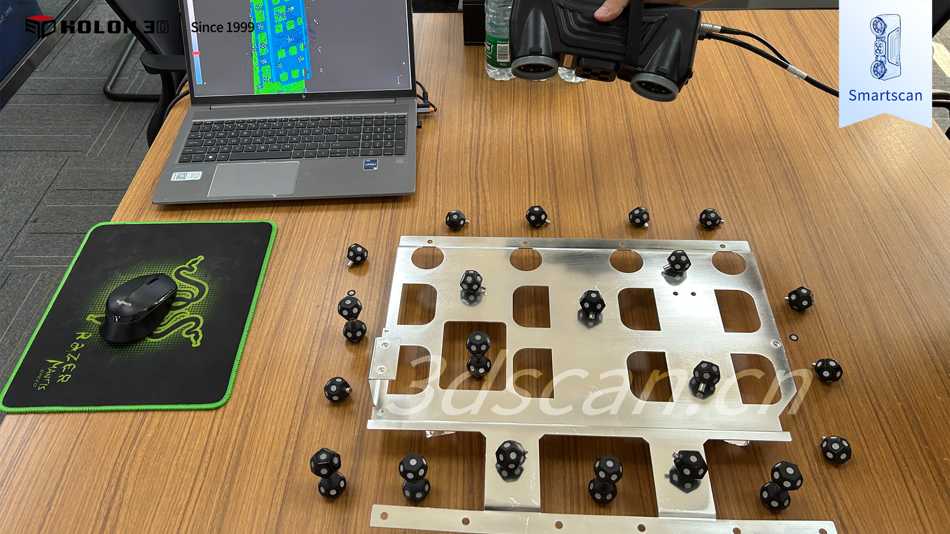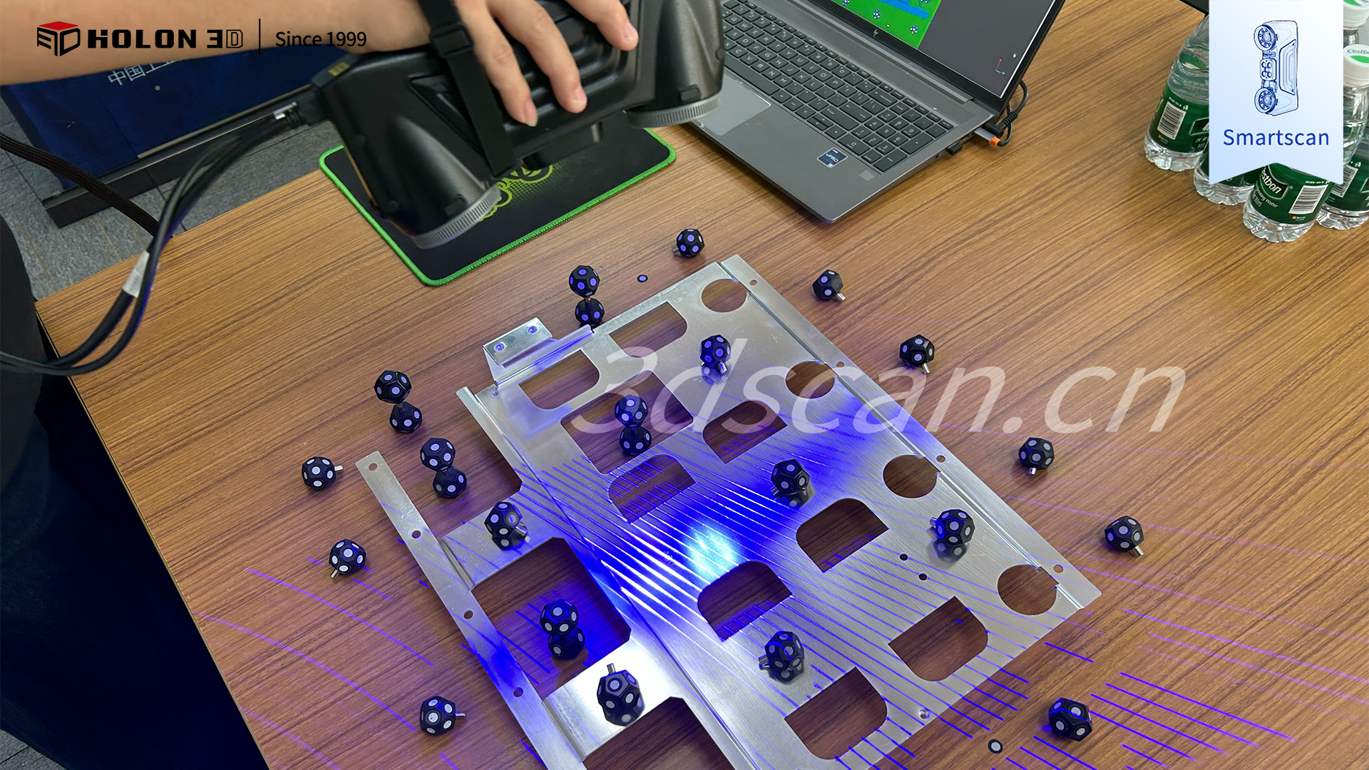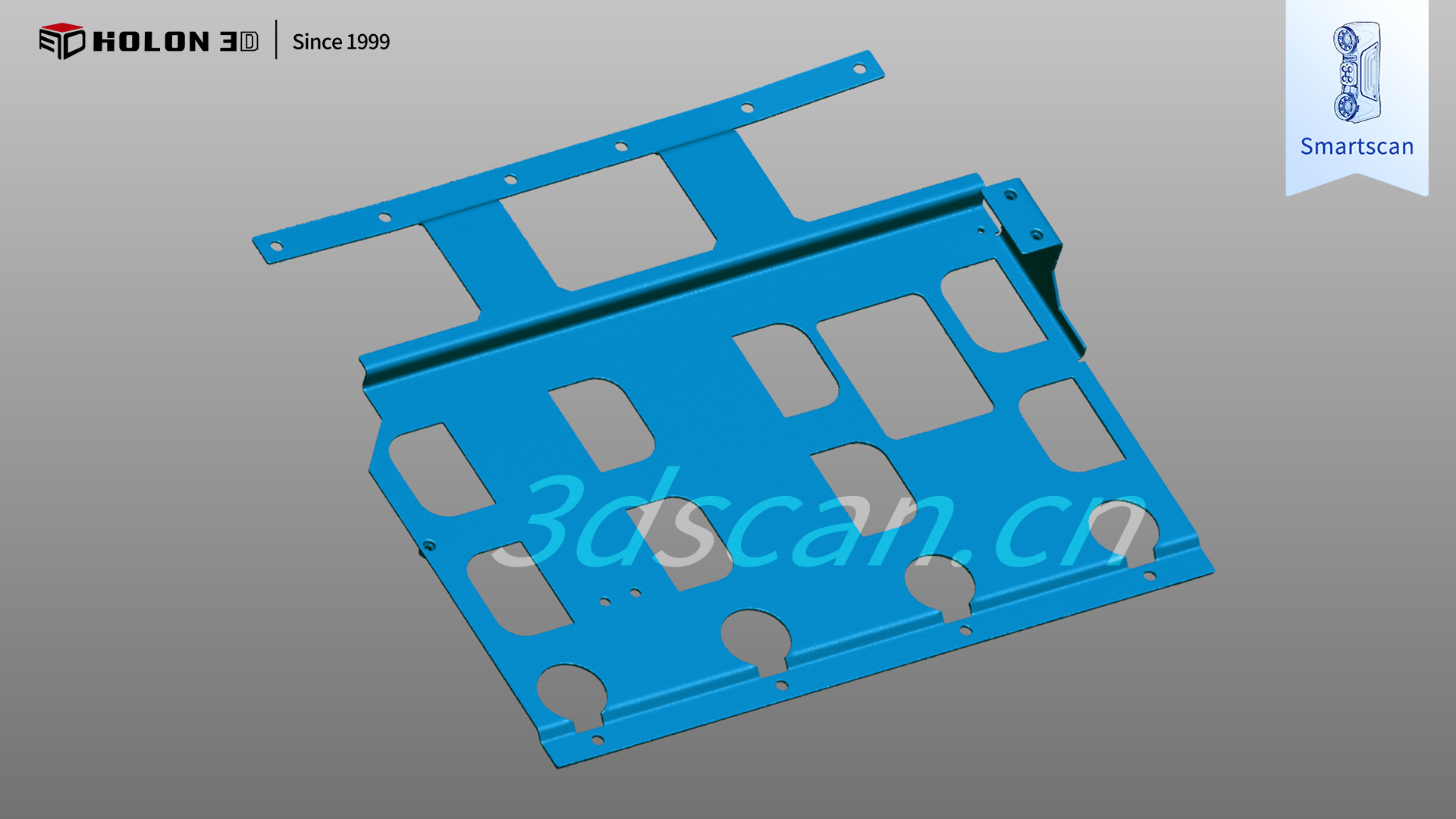 鋁鈑金件是各類設(shè)備的核心結(jié)構(gòu)部件,其外形輪廓、折彎精度及細(xì)節(jié)尺寸直接影響裝配適配性。客戶需通過三維掃描獲取鈑金件高精度完整數(shù)據(jù),與原始模型比對生成三維檢測色譜圖,量化誤差以判斷加工是否合格。因鈑金件表面反光且材質(zhì)較薄,客戶對掃描精度與細(xì)節(jié)還原度要求嚴(yán)苛,傳統(tǒng)測量方式難以滿足,故選擇 HOLON 3D Smart 49 手持式全藍(lán)激光工業(yè)級三維掃描儀提供數(shù)字化檢測方案。