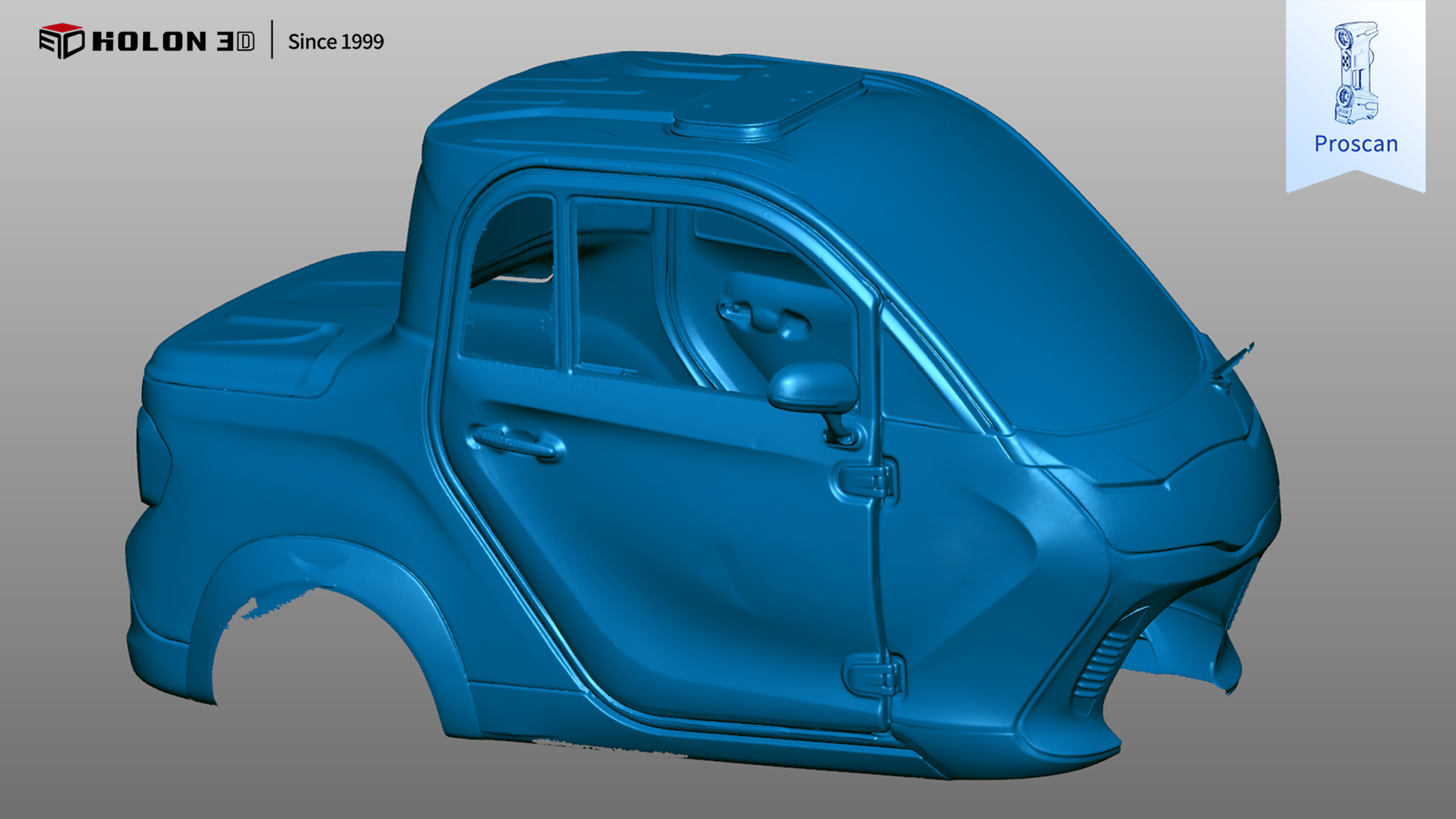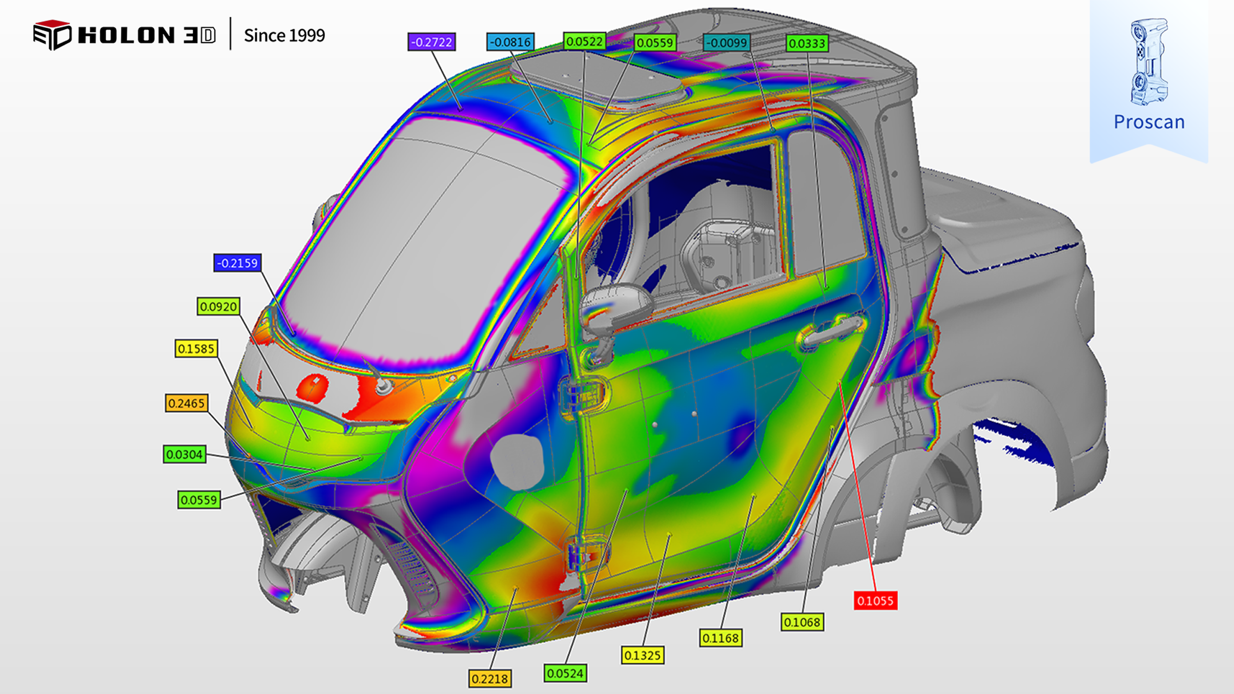 HOLON工程師通過Proscan手持式三維掃描儀突破檢測瓶頸:設(shè)備搭載調(diào)光,無懼深色,適配金屬與塑料等多種材質(zhì),消除高反光干擾,完整獲取車架、輪胎及焊接點數(shù)據(jù);手持式設(shè)計可靈活深入車體狹小空間,以0.02mm精度捕捉隱蔽形變;掃描數(shù)據(jù)經(jīng)智能分析系統(tǒng)與CAD模型智能對齊,生成三維偏差色譜圖,直觀呈現(xiàn)車架彎曲度、軸距偏移等多項參數(shù),并輸出檢測對比報告,為工藝優(yōu)化提供精準(zhǔn)決策支持。