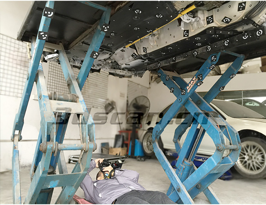 華朗三維掃描儀-貼好標(biāo)志點(diǎn)、編碼點(diǎn)與安放好靶桿的賽車底盤