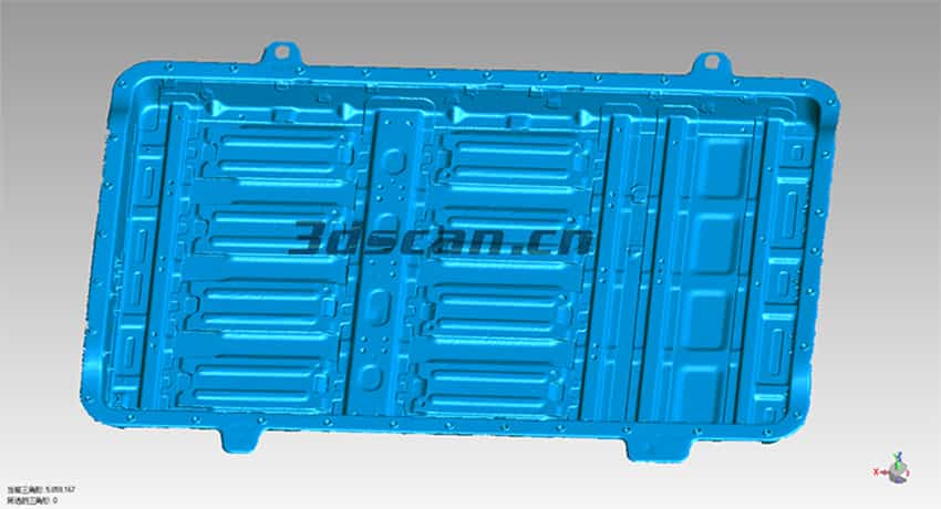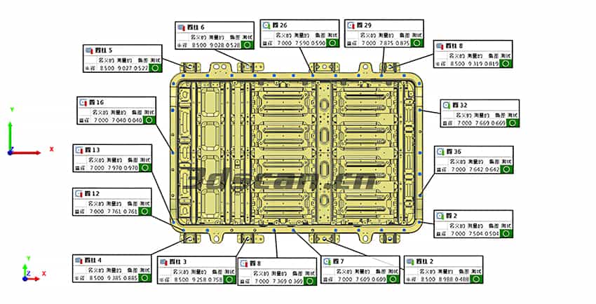 1、新能源汽車電池模組體型較大,表面不規(guī)則,凹槽各異且孔位較多,客戶需要對工件孔位進行精確測量,給傳統(tǒng)的測量工作帶來很大難度。