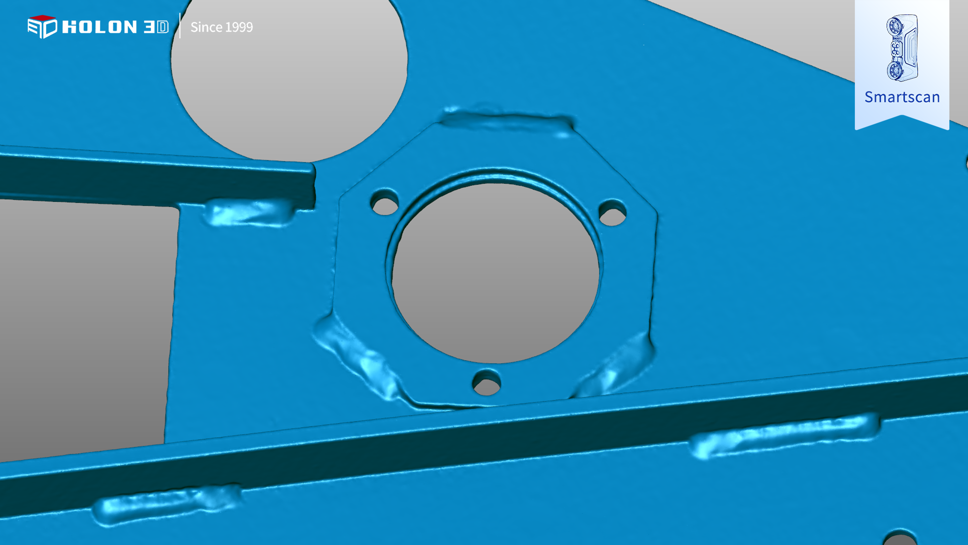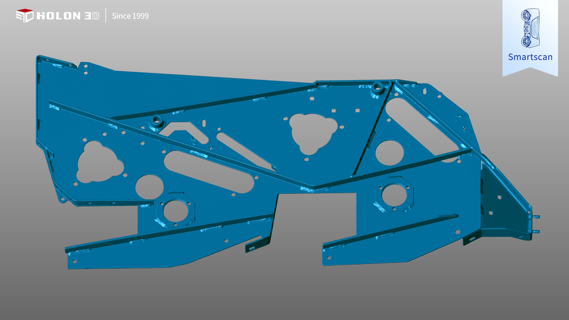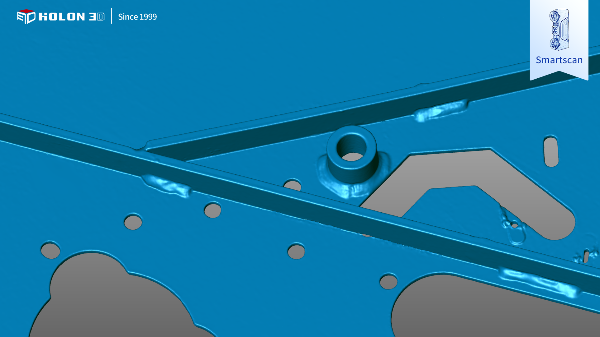 針對上述問題,HOLON 3D采用工業(yè)級三維掃描儀Smartscan 49進行全尺寸檢測:基于420萬點/秒的超高速掃描技術(shù),10分鐘內(nèi)完成鈑金件完整數(shù)據(jù)采集,0.02mm精度精準還原鈑金件形態(tài)及所有孔位三維坐標。設(shè)備通過激光與光柵多模式融合,自動捕捉隱藏孔及復(fù)雜折彎特征,利用對比軟件直接生成孔位偏移矢量圖,完美解決客戶的問題。