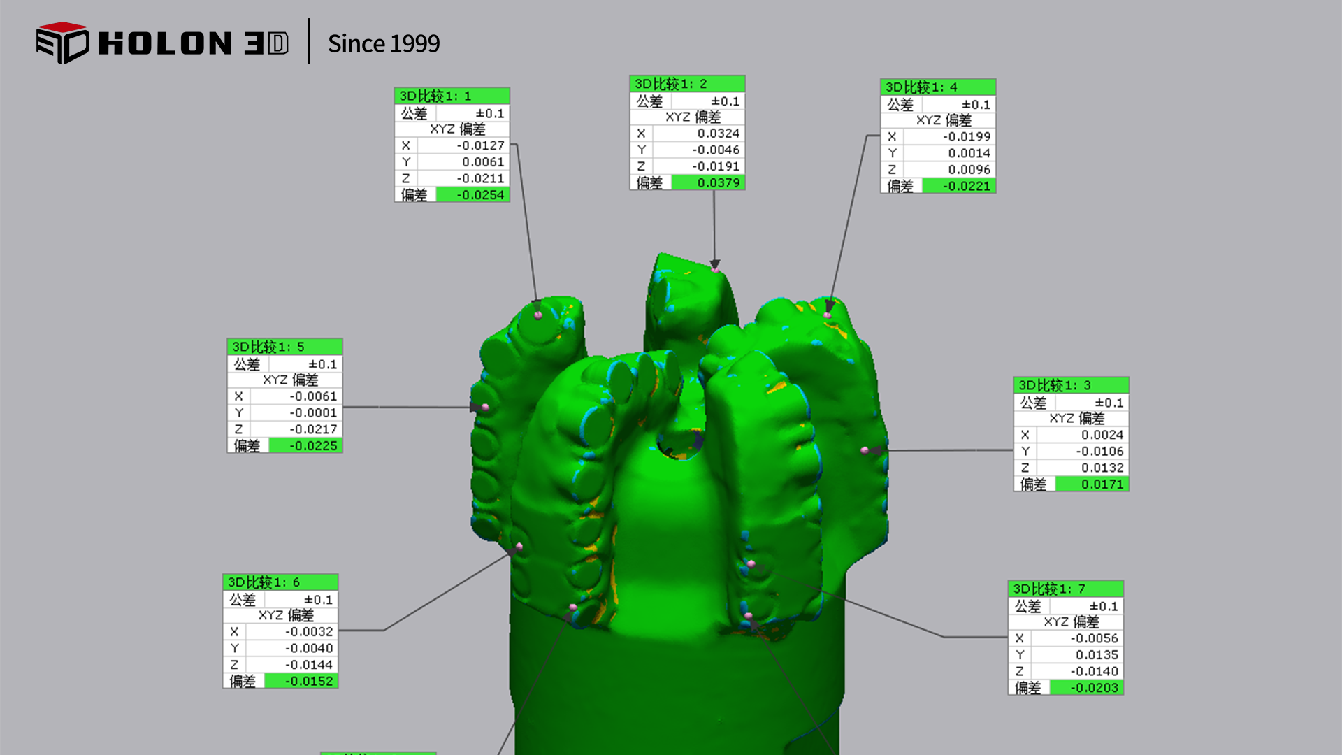 采用手持式三維掃描儀,針對海上惡劣環(huán)境與鉆頭測量需求實(shí)現(xiàn)高效適配。該掃描儀具備高精度性能,可精準(zhǔn)捕捉切削齒磨損量、流道變形等細(xì)微變化,確保鉆井前后的輪廓數(shù)據(jù)誤差極小,滿足比對精度要求;高速掃描能力能在短時(shí)間內(nèi)完成全表面數(shù)據(jù)采集,適配海上作業(yè)的時(shí)效需求;其抗干擾設(shè)計(jì)可適應(yīng)海上顛簸、濕度及光線變化等惡劣條件,手持操作靈活便捷,無需復(fù)雜架設(shè)即可開展掃描。非接觸式測量避免對鉆頭造成二次損傷,掃描后即時(shí)生成數(shù)字化數(shù)據(jù),可直接用于鉆井前后的輪廓比對分析。最終得到的數(shù)據(jù)完整、精準(zhǔn),完全符合客戶對速度、精度及環(huán)境適用性的高要求,為海上鉆井作業(yè)中鉆頭磨損評估與后續(xù)決策提供可靠依據(jù)。