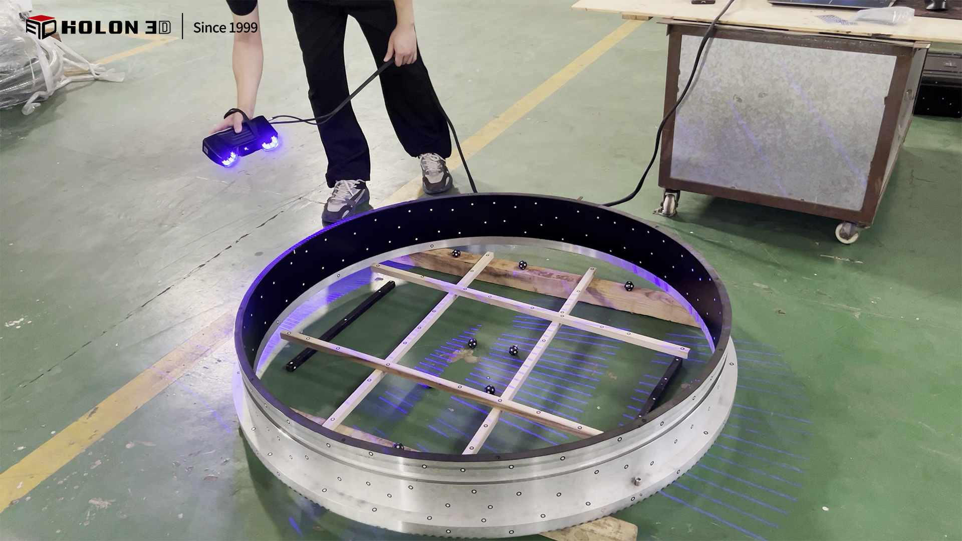 直徑 1.3 米的圓形工件作為工業(yè)生產(chǎn)中常見的大型精密部件,其整體形態(tài)精度與尺寸公差直接影響后續(xù)裝配適配性與設(shè)備運行穩(wěn)定性。客戶需對該圓形工件進行三維掃描,獲取高精度、完整的三維數(shù)據(jù),通過與原始模型比對生成三維檢測色譜圖,借助色譜圖直觀量化誤差分布,以此判斷工件是否合格。由于工件尺寸較大且客戶對掃描精度、數(shù)據(jù)完整性要求極高,同時需適配客戶現(xiàn)場的檢測場景,傳統(tǒng)測量方式難以滿足需求,因此選擇 HOLON 3D Smart 49 手持式全藍激光工業(yè)級三維掃描儀,為圓形工件的精準質(zhì)量檢測提供可靠數(shù)字化支撐。