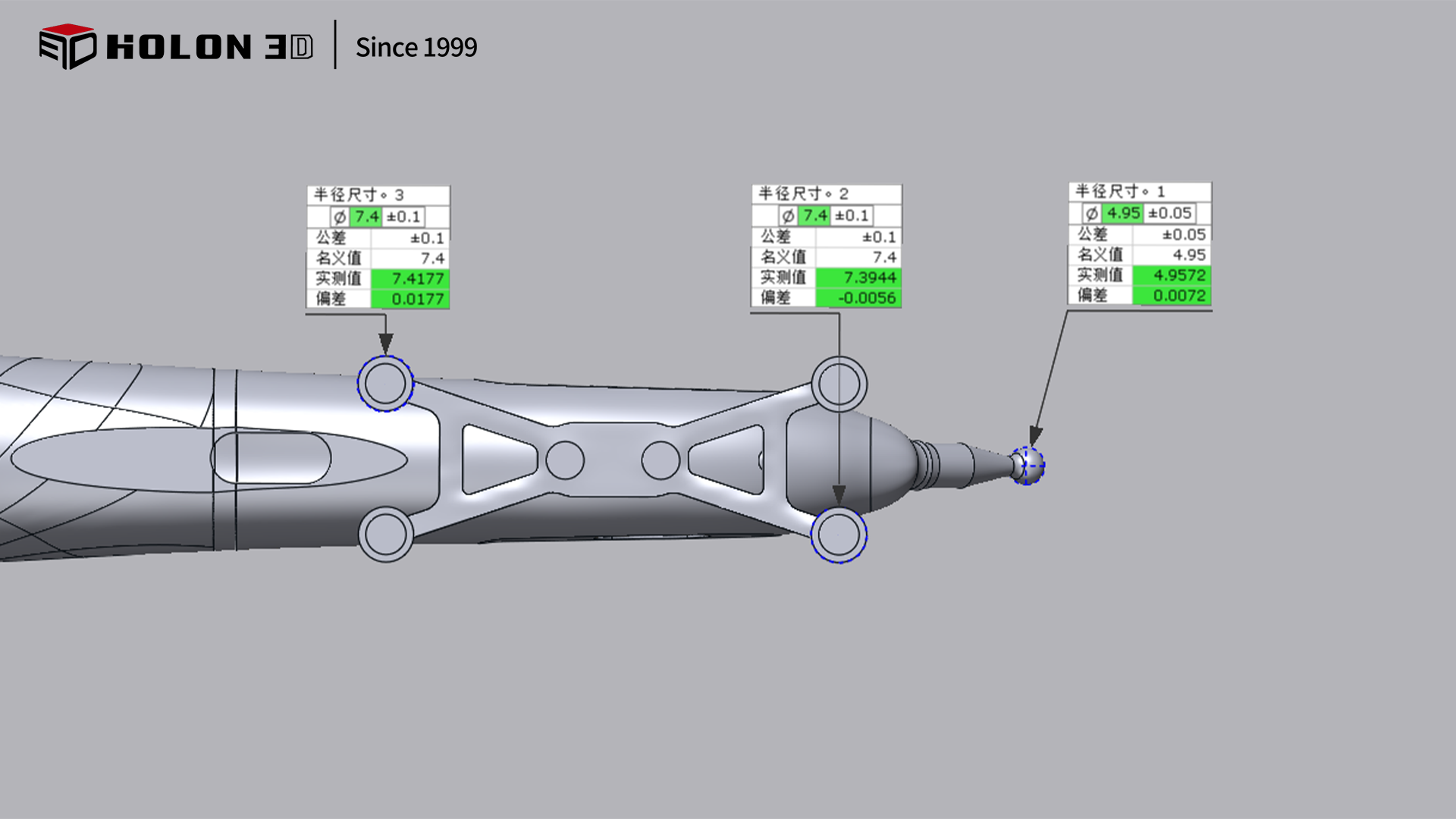 神經(jīng)系統(tǒng)導(dǎo)航儀作為精準(zhǔn)醫(yī)療設(shè)備的核心部件,其結(jié)構(gòu)精度直接關(guān)系到手術(shù)導(dǎo)航的準(zhǔn)確性與安全性。客戶需對該導(dǎo)航儀進(jìn)行三維數(shù)據(jù)采集,通過與原始數(shù)模的三維檢測與對比,量化加工誤差,以此把控產(chǎn)品質(zhì)量。由于導(dǎo)航儀表面特征細(xì)微,且客戶對掃描精度有極高要求,傳統(tǒng)測量方式難以滿足需求,因此選擇 HOLON 3D smart 49 手持式全藍(lán)激光三維掃描儀,為設(shè)備的質(zhì)量檢測提供精準(zhǔn)數(shù)據(jù)支撐。