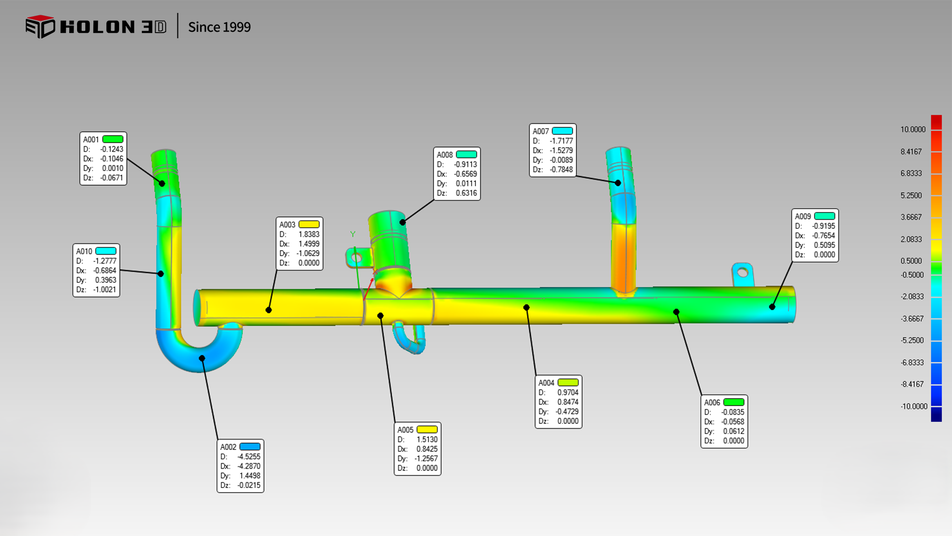 對(duì)于要解決測(cè)量空調(diào)管道尺寸與平行度問(wèn)題,我司工程師采用手持式三維掃描儀HOLON760,用的是藍(lán)色激光線(xiàn)。使用掃描儀快速全面掃描獲取工件高精度三維數(shù)據(jù),掃描用時(shí)短,速度極快,單機(jī)體積精度掃描高。有效解決了在掃描過(guò)程中遇到的問(wèn)題,無(wú)需做前期工作準(zhǔn)備,節(jié)省時(shí)間,提高工作效率。把掃描獲取數(shù)據(jù)導(dǎo)入到三維檢測(cè)軟件中與原始數(shù)模進(jìn)行對(duì)比分析。細(xì)節(jié)掃描效果很好,數(shù)據(jù)完整,精度高,客戶(hù)能通過(guò)分析對(duì)比直觀知道空調(diào)管道尺寸跟平行度存在的偏差??蛻?hù)很滿(mǎn)意掃描數(shù)據(jù),為后期的工作提供了數(shù)據(jù)參考。