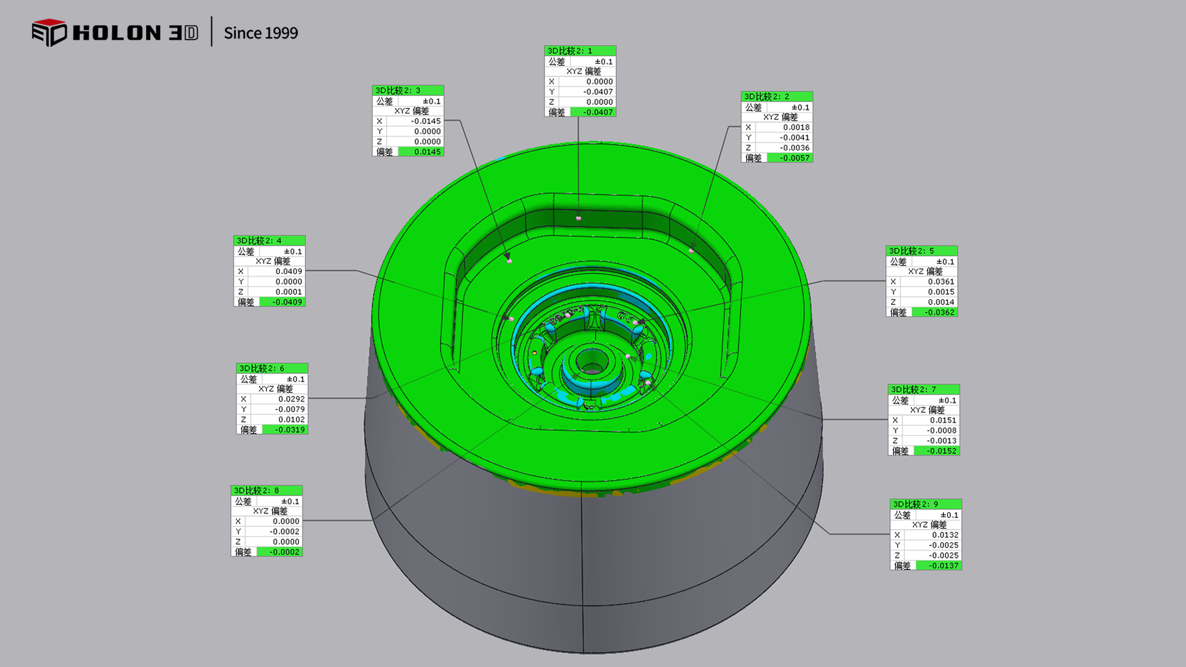 采用 HOLON 3D Model 49 手持式三維掃描儀,憑借全藍(lán)激光線束掃描技術(shù),有效應(yīng)對(duì)精鍛模具的測(cè)量挑戰(zhàn)。全藍(lán)激光能針對(duì)性抑制表面反光,確保在光滑表面上也能穩(wěn)定采集數(shù)據(jù),避免反光導(dǎo)致的信息失真,完整還原模具的型腔輪廓、細(xì)微紋路等關(guān)鍵特征;設(shè)備具備高精度性能,可精準(zhǔn)捕捉模具的尺寸偏差與形態(tài)變化,為與原始數(shù)模的對(duì)比分析提供可靠數(shù)據(jù)基礎(chǔ);高速掃描能力大幅提升數(shù)據(jù)采集效率,快速完成全表面掃描,滿(mǎn)足客戶(hù)對(duì)速度的高要求;非接觸式操作避免對(duì)光滑表面造成損傷,手持設(shè)計(jì)靈活便捷,可輕松適配模具的復(fù)雜結(jié)構(gòu)與掃描角度。最終得到的數(shù)據(jù)精準(zhǔn)、完整,完全符合三維檢測(cè)的需求,助力客戶(hù)精準(zhǔn)評(píng)估模具質(zhì)量,及時(shí)優(yōu)化生產(chǎn)工藝,保障鍛件的成型精度與生產(chǎn)穩(wěn)定性。