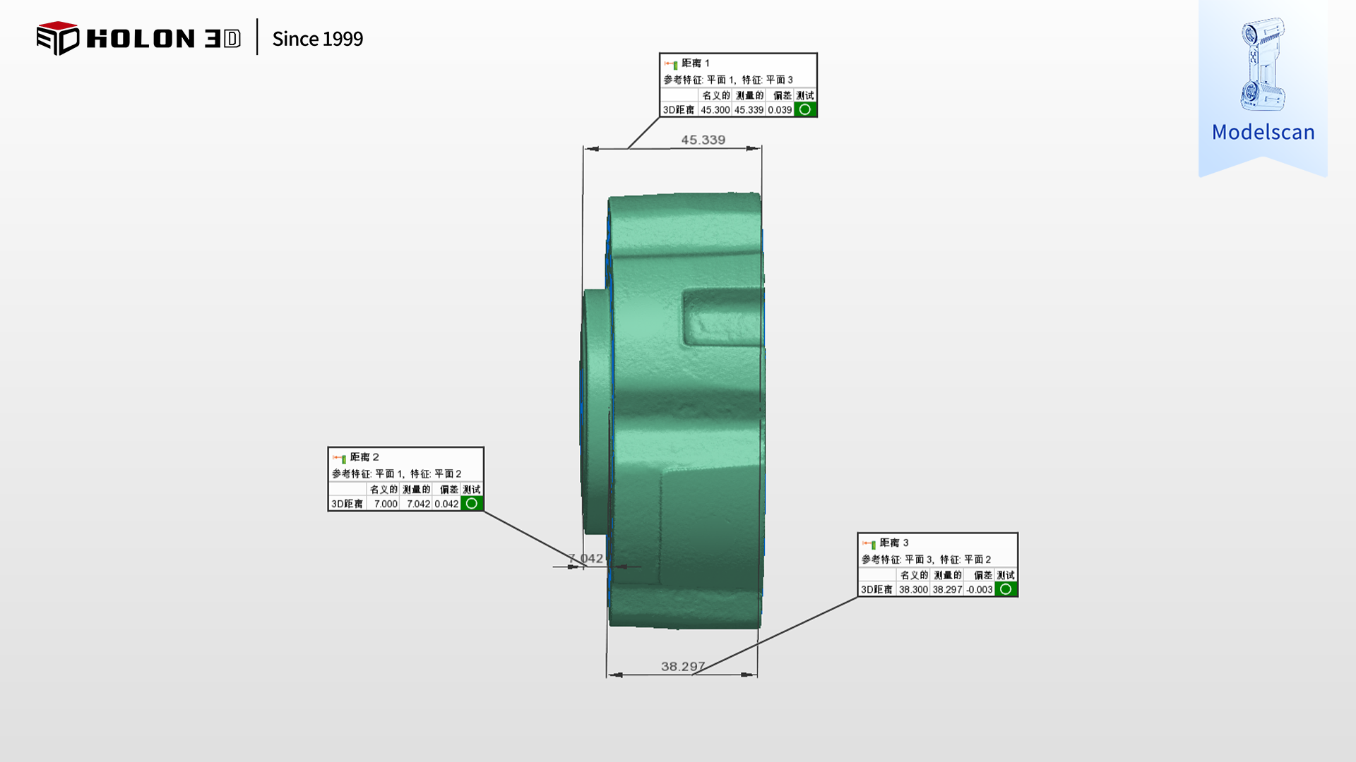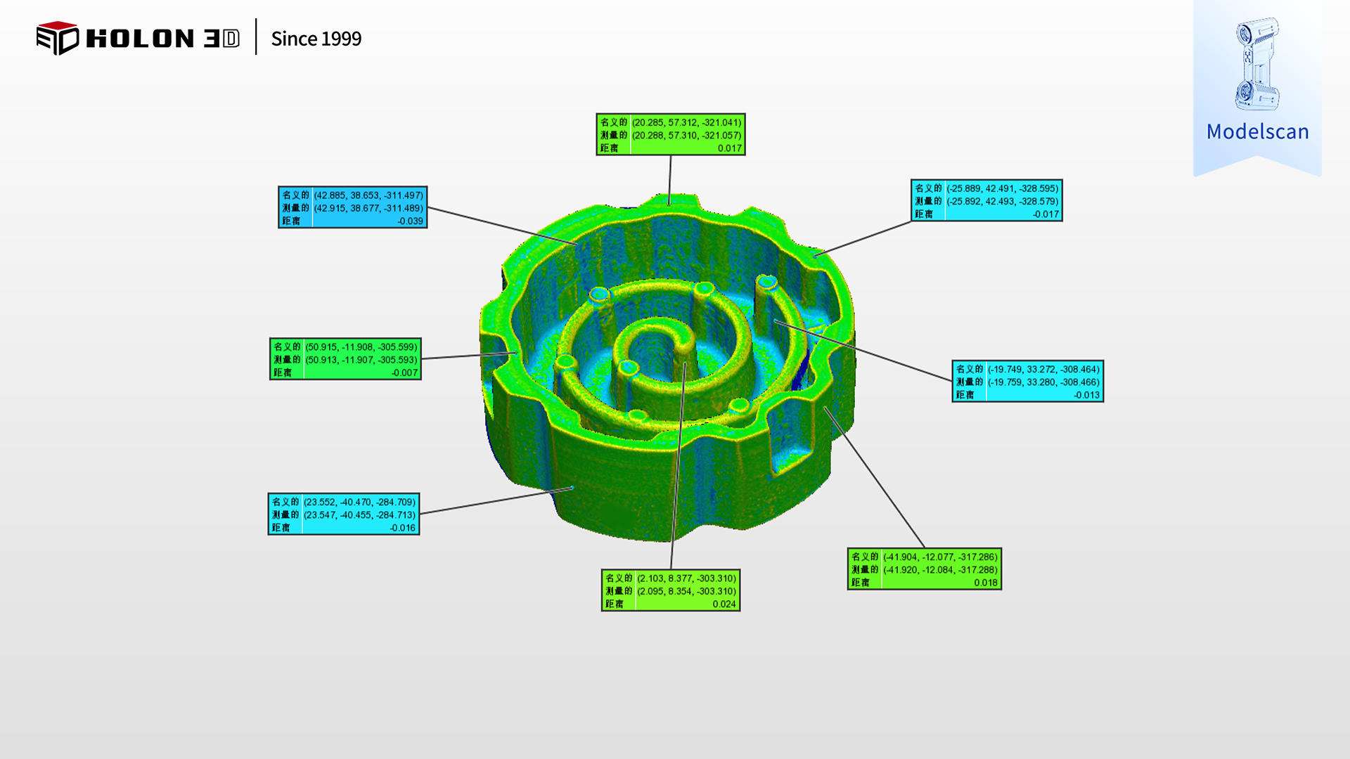 采用 HOLON 3D Model 49 手持式全藍(lán)激光工業(yè)級三維掃描儀,可針對性破解動、靜盤毛胚澆鑄件檢測的核心難題。該掃描儀具備工業(yè)計量級精度,實測精度達(dá) 0.02mm,最高可達(dá) 0.01mm,搭配全藍(lán)激光技術(shù),不懼不同毛胚澆鑄件的不同表面材質(zhì)特性,無論是澆鑄后的啞光粗糙面還是局部反光區(qū)域,都能穩(wěn)定穿透表面干擾,精準(zhǔn)采集數(shù)據(jù);更搭載四種專屬掃描模式,可根據(jù)鑄件的型面過渡區(qū)域、微小預(yù)留結(jié)構(gòu)、邊緣輪廓等不同特征細(xì)節(jié)靈活切換,高效捕捉每一處關(guān)鍵結(jié)構(gòu)與澆鑄固有細(xì)微特征,確保細(xì)節(jié)還原度與數(shù)據(jù)完整性,為生成精準(zhǔn)三維檢測色譜圖奠定堅實基礎(chǔ);手持設(shè)計靈活便捷,不受毛胚澆鑄件體型與復(fù)雜型面限制,可自由調(diào)整掃描角度,輕松覆蓋鑄件的正反兩面、邊緣及隱蔽部位,無測量盲區(qū);高速掃描能力大幅縮短單件檢測時間,配合無接觸式測量方式,既避免了測量工具磨損與鑄件表面損傷的風(fēng)險,又能快速獲取全表面可靠數(shù)據(jù),高效支撐合格性判定;掃描儀適應(yīng)性強,不受場景約束,在車間、倉儲等不同環(huán)境下,僅需粘貼少量標(biāo)志點輔助定位,無需額外復(fù)雜前期準(zhǔn)備(如表面打磨、噴粉),即可穩(wěn)定輸出高質(zhì)量數(shù)據(jù)。掃描后生成的三維數(shù)據(jù)精準(zhǔn)、完整且細(xì)節(jié)還原度高,與原始模型比對可清晰生成三維檢測色譜圖,能準(zhǔn)確量化型面偏差、壁厚均勻性等關(guān)鍵指標(biāo)的誤差,科學(xué)判斷毛胚澆鑄件合格性,完全符合客戶的嚴(yán)苛需求,為動、靜盤毛胚澆鑄件的質(zhì)量管控、澆鑄工藝優(yōu)化及批量生產(chǎn)提供了可靠的數(shù)字化保障。