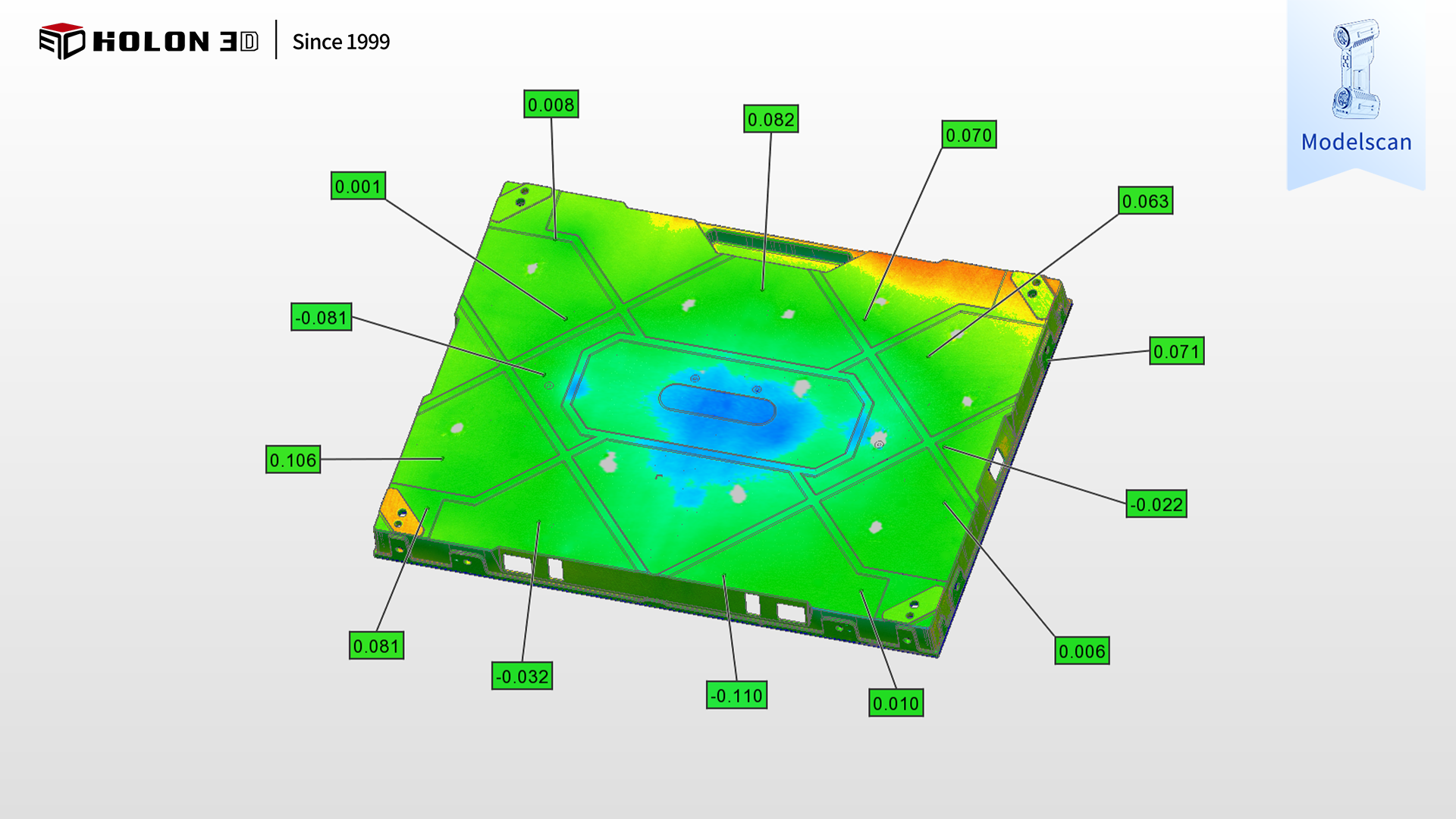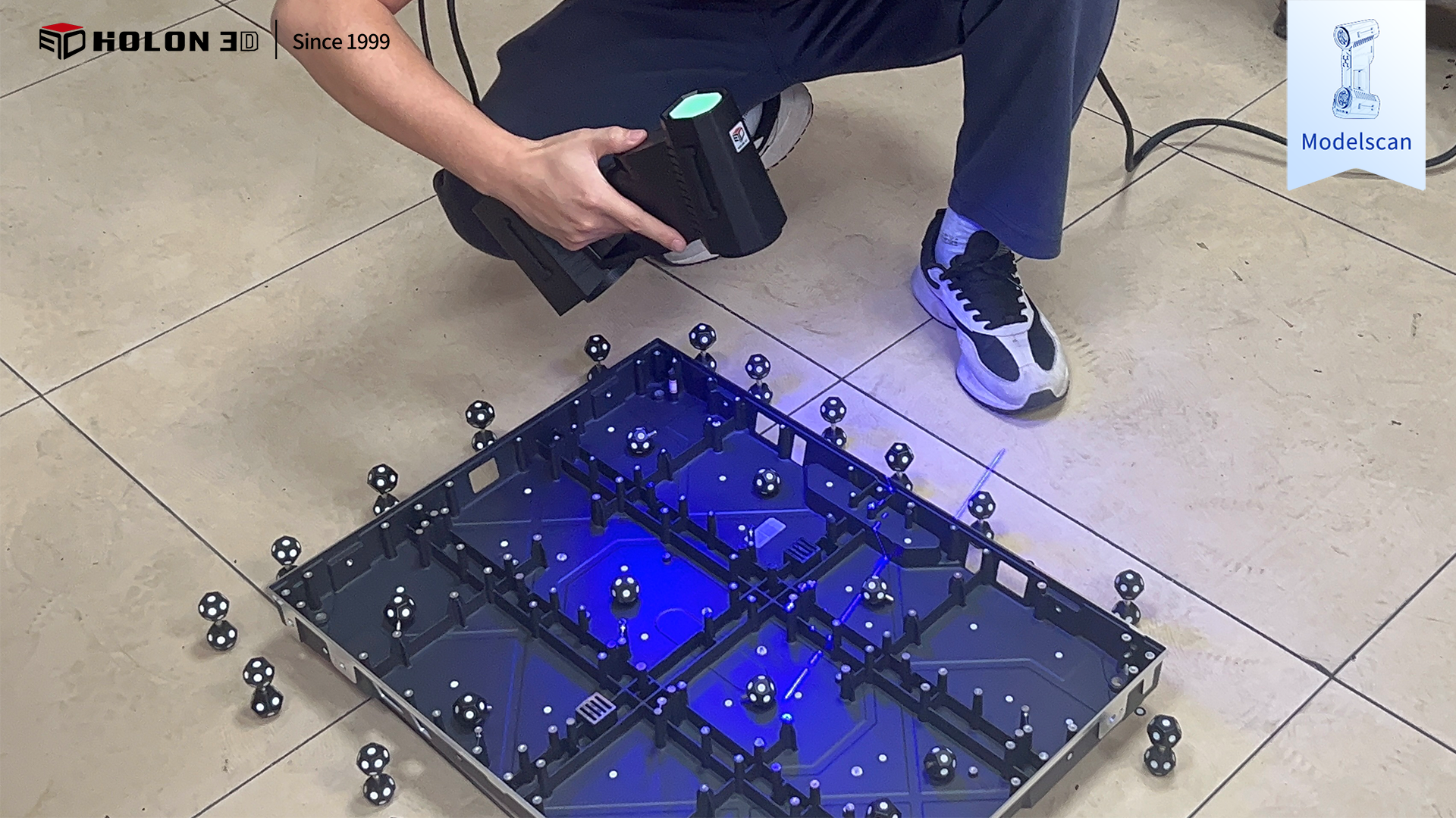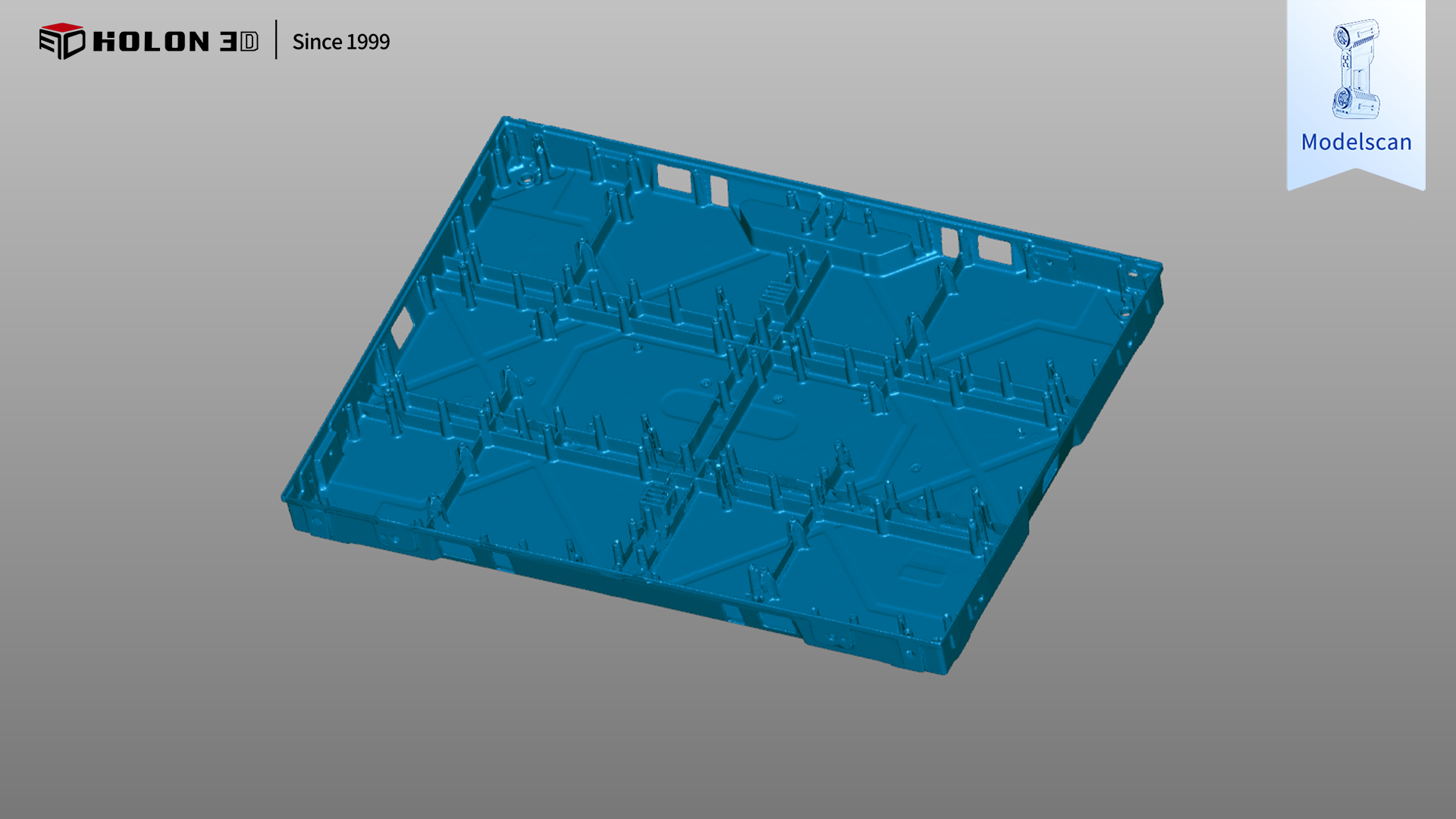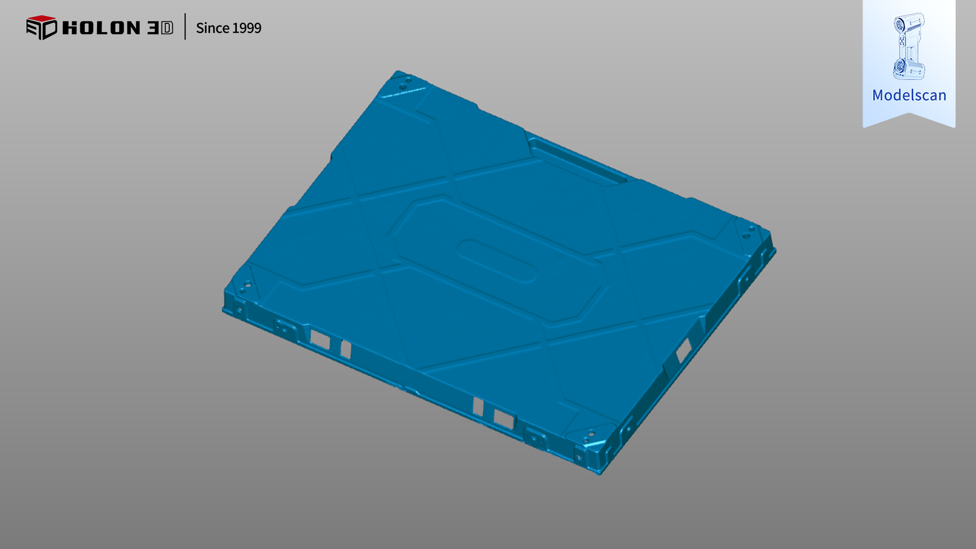 電池包組裝外殼是保障電池組安全裝配與穩(wěn)定運(yùn)行的核心部件,其外形輪廓、安裝位精度直接影響電池包裝配適配性與防護(hù)性能。客戶(hù)需通過(guò)三維掃描獲取外殼高精度完整數(shù)據(jù),與原始模型比對(duì)生成三維檢測(cè)色譜圖,量化誤差以判斷加工是否合格。因外殼整體呈黑色、安裝位較多,客戶(hù)對(duì)掃描精度與細(xì)節(jié)還原度要求嚴(yán)苛,傳統(tǒng)測(cè)量方式難以滿足,故選擇 HOLON 3D Model 49 手持式全藍(lán)激光工業(yè)級(jí)三維掃描儀提供數(shù)字化檢測(cè)方案。
